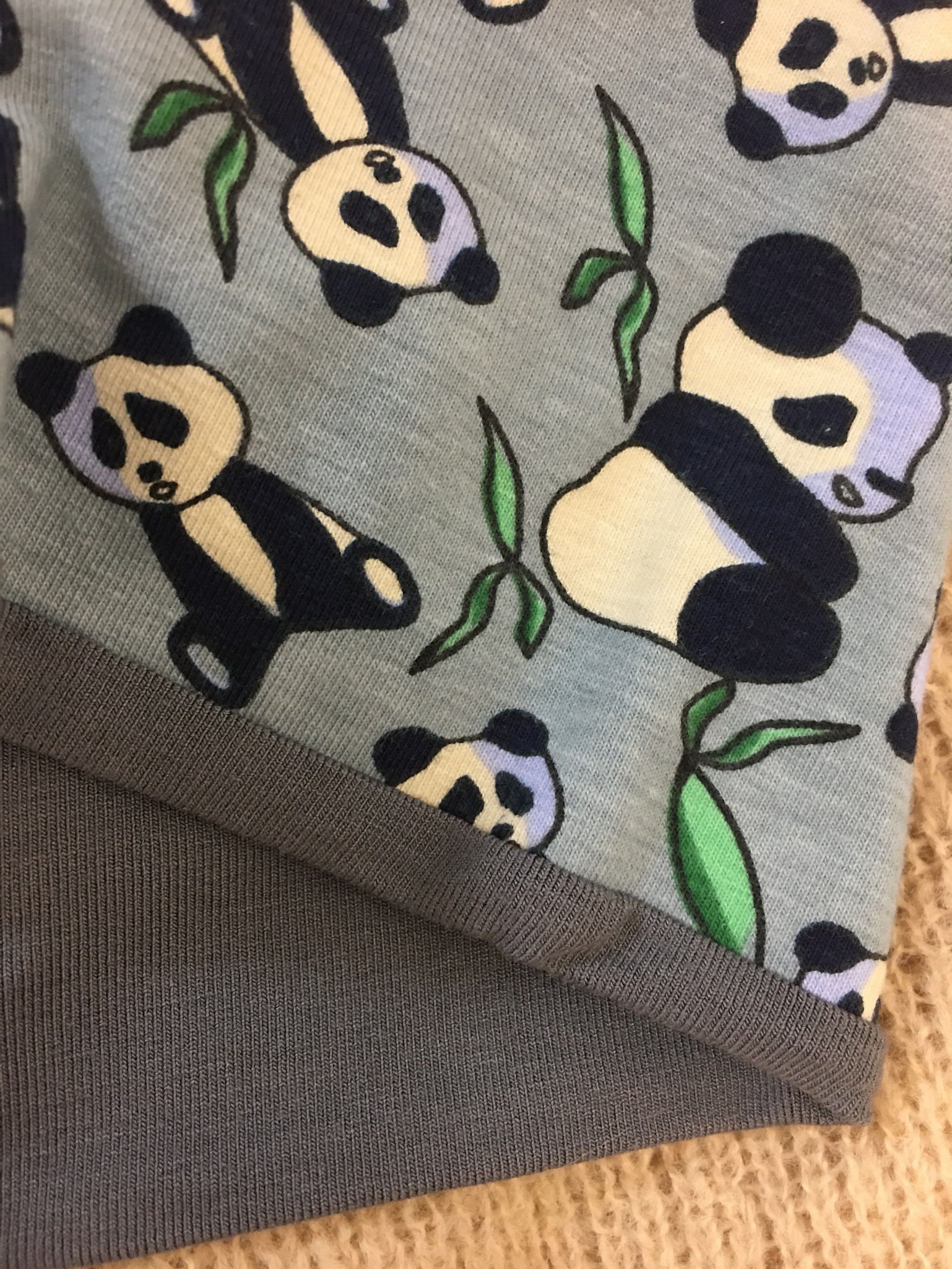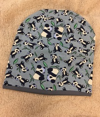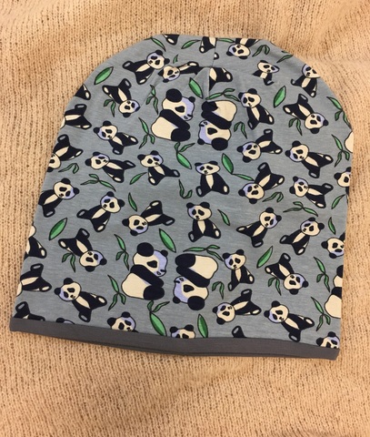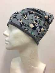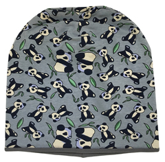 Удлинненная шапочка для лета из хлопкового и вискозного трикотажа с принтом мини пандочки с зелёными листиками эвкалипта на сером фоне.