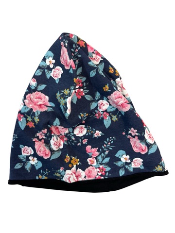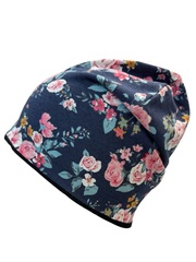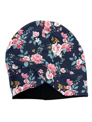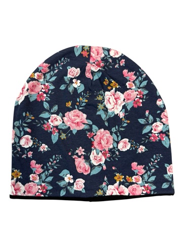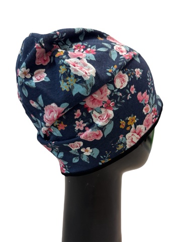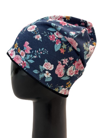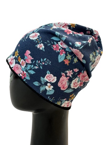 Удлинненная шапочка для лета из хлопкового и вискозного трикотажа с цветочными мотивами.