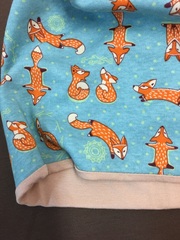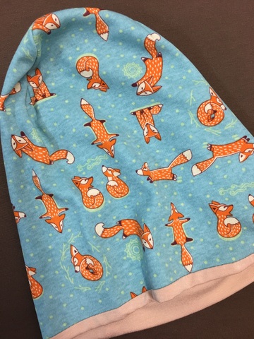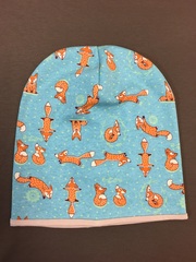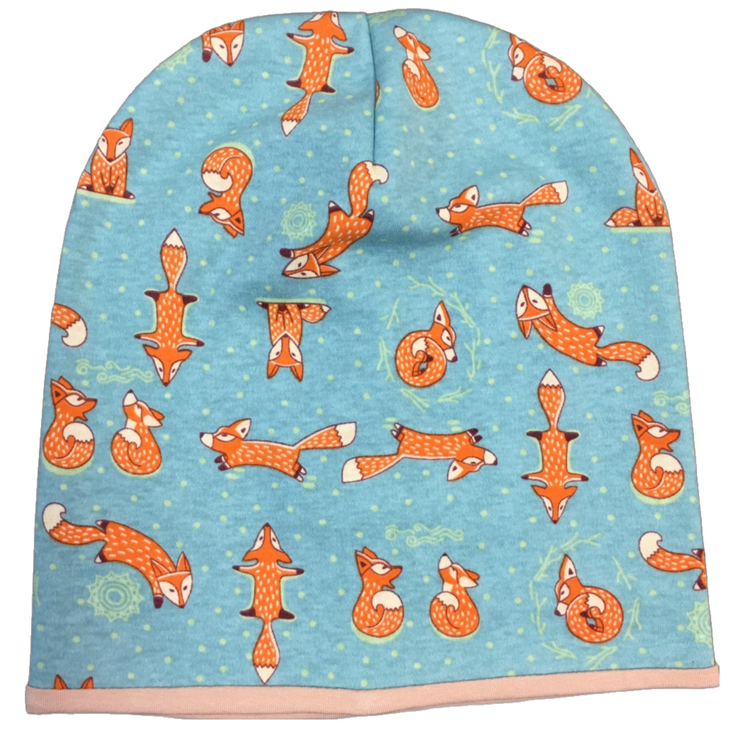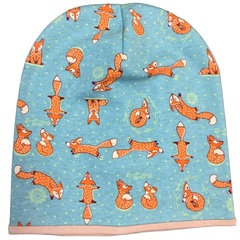 Принт лисички на мятном фоне делает шапку яркой и запоминающейся. Также есть вариант с лисичками на зеленом трявяном фоне.