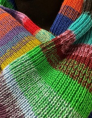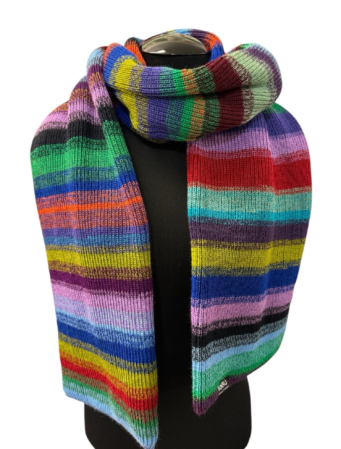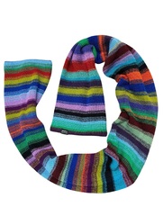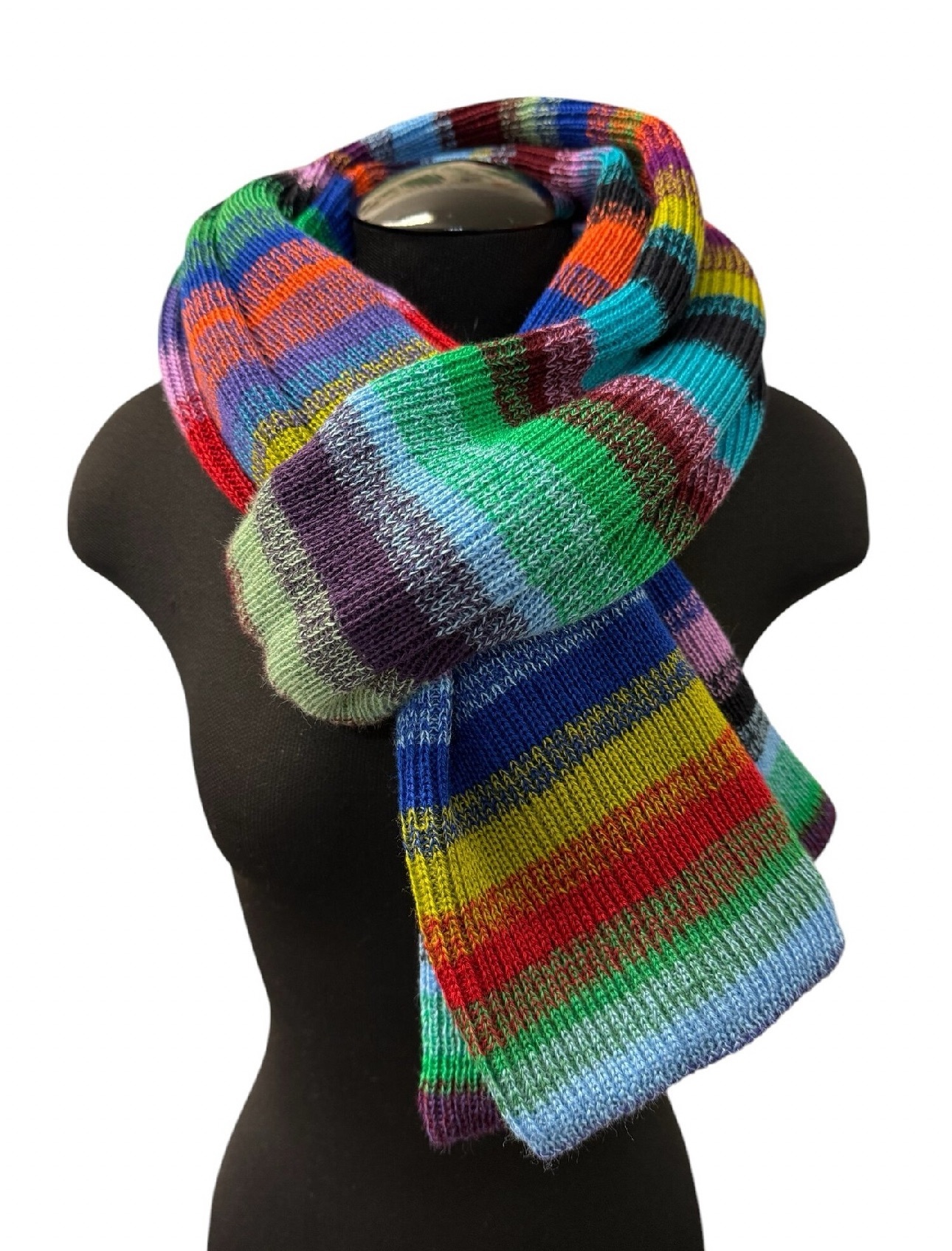 Классический двойной шарф с разноцветными полосками различного размера. Ширина 24 см, длина 190 см. Пряжа 50% шерсть, 50% акрил. Связан на нашем производстве в Санкт-Петербурге.